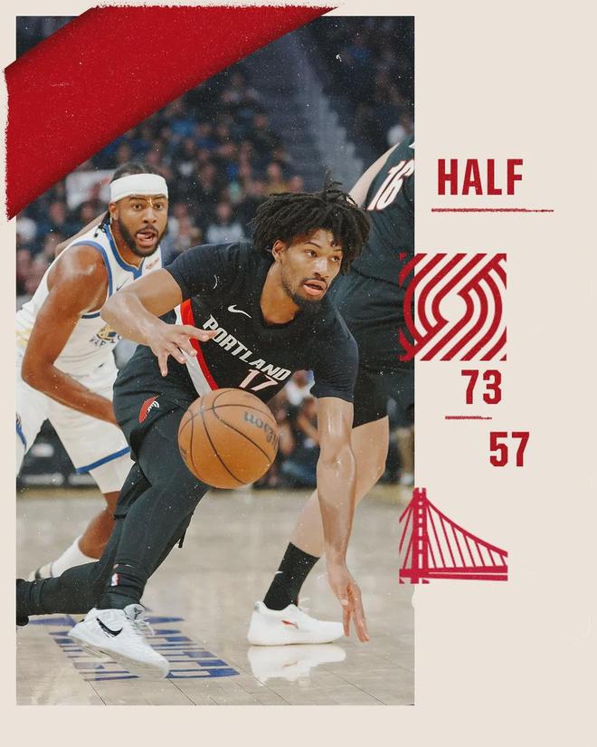 上半场打完,开拓者73-57领先勇士16分。夏普20分3板2助、阿夫迪亚13分6板2助、卡马拉12分3板2助。勇士这边,巴特勒12分2板3助2断、库里11分4板3助。杨瀚森打了10分钟,1投0中,得到0分1板1助2失误1犯规,正负值+3。