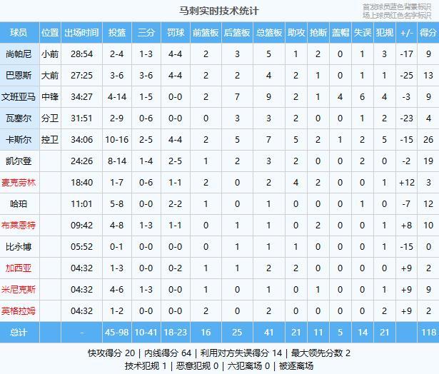 马刺数据(客队):卡斯尔26分7板5助2断、凯尔登19分3板2助、巴恩斯13分4板2助、哈珀12分1板、布莱恩特10分1板2断、文班亚马9分9板2助4帽、尚帕尼9分5板1助2断、米尼克斯9分1板、瓦塞尔4分3板2助